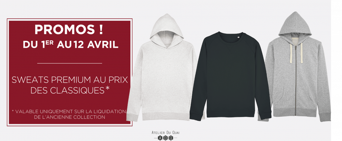 Avez-vous déjà essayé la gamme de sweat premium de l’Atelier du Quai ? Si non, vous avez loupé quelque chose ! Et bonne nouvelle, l’équipe de l’Atelier du Quai vous propose des soldes sur tous les sweats premiums, du 1er au 12 avril 2019. Oui oui, ce n’est pas une blague ! Pendant 2 semaines, les sweats premiums sont au tarif des sweats classiques (uniquement sur la liquidation de l’ancienne collection). Alors n’hésitez plus et passez nous voir en magasin pour personnaliser à votre image un sweat premium pas cher.